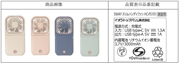 イオンリテールは2025年6月25日、携帯扇風機「トップバリュ ホームコーディ 5WAY スリムハンディファン(品番:HC-FS101)」(販売期間:2025年4月9日〜6月20日)について、(1)使用中に羽根が折れる可能性がある、(2)充電中に異常発熱/発煙する事例が確認されたため、リコールを発表した。対象数は2万1750台。回収/返金で対応する。経済産業省のWebサイトには、重大製品事故を契機としたリコール製品として明記されている。