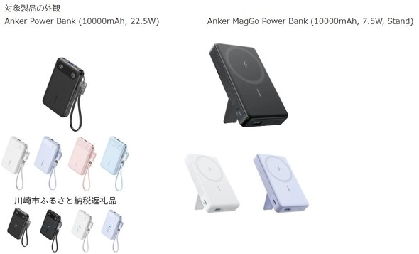 新たにリコール対象となった「Anker Power Bank(10000mAh,22.5W)」(左)と「Anker MagGo Power Bank(10000mAh,7.5W,Stand)」(右)[クリックで拡大] 出所:アンカージャパン| 商品名 | 色 | JANコード | 型番 | 販売期間 | 対象台数 |