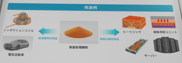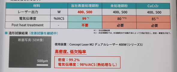 レーザーPBF方式用表面処理銅紛は、独自の表面処理により、高純度かつ純銅相当の高電気伝導率と高熱伝導率を実現した他、未処理の純銅紛では造形が困難なレーザー出力400Wや500Wでも3Dプリントできる。生産性は、銅-クロム-ジルコニウム(CuCrZr)などの銅合金に相当し、造形後に熱処理をすることなく、CuCrZrに比べて優れた電気伝導性と熱伝導性を備えている。