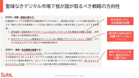 このようにモノづくりのソフトウェアを含めて厳しいデジタル赤字が予測されているわけだが、日本企業に光明はないのだろうか。デジタル経済レポートでは、デジタル赤字を削減するために短期的には受け取りを増やすことを挙げており、その手段には「高利益/高成長率のソフトウェアプロダクトへの支援」と「先行プラットフォーム事業者がカバーしていない領域の奪取」がある。権藤氏は「モノづくりのソフトウェア関連では、SDVを含むSDXで中国が優勢ではあるもののまだ制覇されていないので領域奪取のチャンスがある」と補足する。