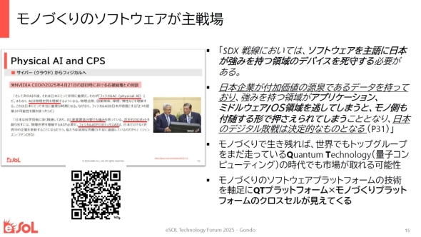 ここまでのデジタル経済レポートを中心とする分析結果は経済観点に基づくものだ。そこで出ている結論は「ソフトウェアプラットフォームを制する者がSDXを制する」ということだ。今後の来るべきサイバーフィジカルシステム(CPS)を実現していくための技術的観点でも、ソフトウェアプラットフォームを重要とする点で変わらない。