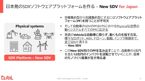 そこで権藤氏が提案するのが、自動車向けのSDVにとどまらない日本発のSDXソフトウェアプラットフォームとなる「New SDV」である。同氏は「Vehicleは英語では自動車に限らず動くもの全てを指す。日本国内にはロボット、AGV(無人搬送車)、ドローン、船舶、インフラ制御などあらゆるVehicleの産業がある。これらを包含するNew SDVに対応するプラットフォームを生み出すことで自動車の4兆円を含む約12兆円の隠れデジタル赤字をひっくり返すことが日本のモノづくり産業の生き残る道ではないか」と述べる。