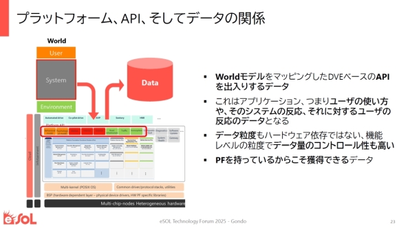 このNew SDVのプラットフォームでは意味を持ったデータ収集が可能になり、データの粒度もハードウェア依存ではない機能レベルの粒度となり、データ量のコントロール性も高いという。「プラットフォームを持っているからこそ獲得できるデータだ。特に、DVEモデルに基づくAPIの切り方が重要になる」(権藤氏)という。