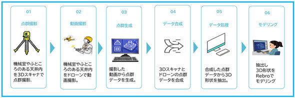 実用化に先立ち、国土交通省への機体登録や無線局開局など必要な手続き、安定飛行のための操縦トレーニングを実施。高精度な3Dモデルを作成できるような飛行方法や動画撮影条件の検証も実施した。また、撮影動画から点群データ化し、BIMソフト(Rebro)データにする一連のデータ処理方法を確立した。