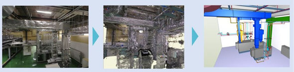 三機工業は、キャド・ケンドロと共同で、既存設備のデジタル化手法を確立した。レーザースキャナーと点検用小型ドローンの併用で、狭い閉鎖空間などこれまで3Dモデル化が困難だった場所を高精度にデジタル化できる。