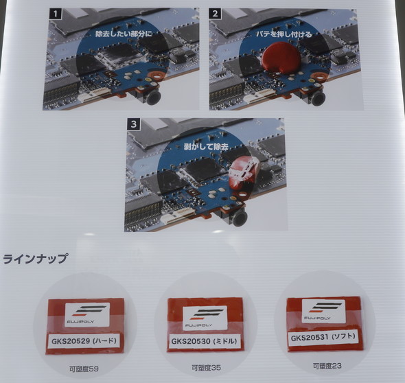 富士高分子工業の説明員は「ユーザーはこれまで、半導体にさまざまなシリコン系放熱材を取り付け評価する際に、その後の放熱材除去に困っていた。従来は、タオルやピンセットなどでシリコン系放熱材を取り除いており、手間がかかったり基板を傷つけたりするリスクがあった。そこで、当社は掃除用パテを開発した」と話す。