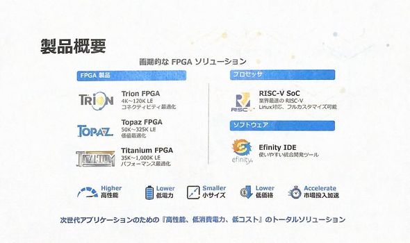 エフィニックスは2012年に米国で創業したFPGA専門のスタートアップ企業だ。エフィニックスのFPGAは「高性能」「低消費電力」「小サイズ」「低価格」という特徴がある。プロセッサはライセンスフリーの「RISC-V SoC」を採用し、開発ツールである「Efinity IDE」は無償で提供している。