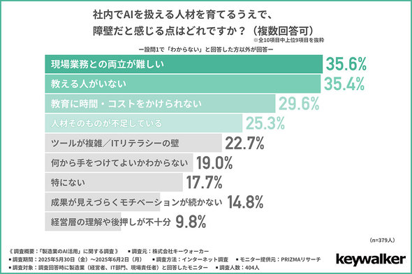 続いて、AI人材の育成について尋ねた。社内でAIを扱える人材を育てる上で、障壁と感じる点として多かった回答は、「現場業務との両立が難しい」(35.6%)、「教える人がいない」(35.4%)、「教育に時間、コストをかけられない」(29.6%)だった。育成以前に「既存業務との両立」「誰が教えるのか」「どう時間を確保するのか」という基本的な課題があることがうかがえる。
