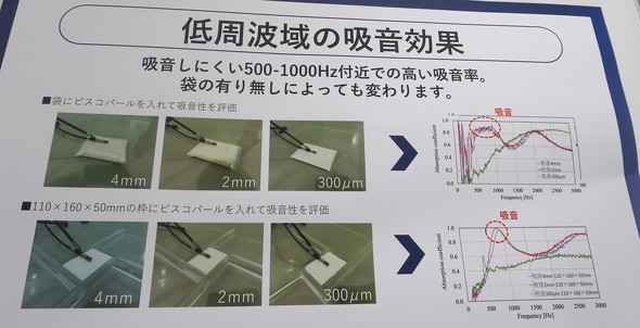 同社がビスコパールの多孔質構造を生かして開発を進める吸音材は、500〜1000Hz付近で高い吸音率を発揮することが確認されている。レンゴーの説明員は「4mm径など特定の大きさのビスコパールは、内部の微細な穴が低周波音を吸音することが分かっている」と話す。