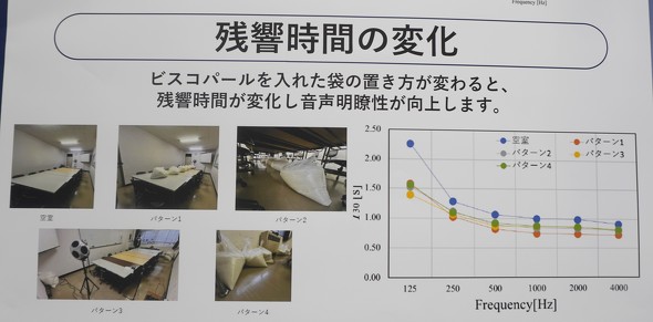 同社は、袋にビスコパールを封入した場合と110×160×50mmの枠にビスコパールを入れた場合を比べ評価した。その結果、袋にビスコパールを封入した場合より、110×160×50mmの枠にビスコパールを入れた場合の方が吸音率が高いことが分かった。加えて、袋に封入されたビスコパールは置き方を変えることで残響時間が変化し、音声明瞭性の向上にも寄与することが確認されている。