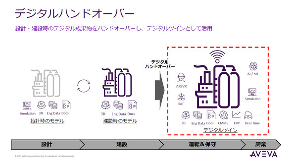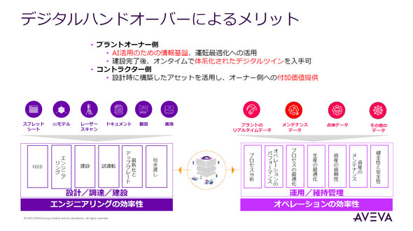 AVEVA 技術営業部 部長の岡本翔太郎氏は、プラントのエンジニアリングにおいて広がっている「デジタルハンドオーバー」について説明。設計、建設時のデジタル成果物をオーナー側にハンドオーバー(引き渡す)することで、オーナー側は運転開始後すぐにデジタルツインなどに活用できる。