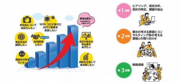 弁理士知財キャラバン事業におけるコンサルティングの流れは、まず初めに課題をヒアリングして企業分析をする。その後、クライアント企業と考えをすり合わせ、知的財産戦略を提案する。