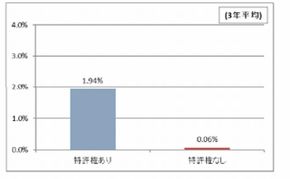 特に、将来のためにどれくらい研究費に投資をしているかを評価する指標の1つである「売上高研究開発比率」に大きな影響が出ている。特許権を所有する企業の売上高研究開発比率は特許権を所有しない企業と比べた際に、約32倍もの差が出ている。