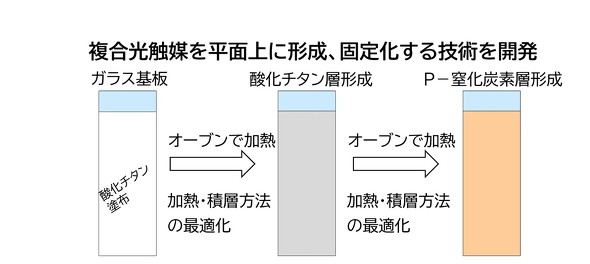 今回の研究では、ホウケイ酸ガラス基板上に、窒化炭素、ルテニウム錯体、酸化チタンを組み合わせた複合光触媒を固定化する技術を開発した。同技術は、ホウケイ酸ガラス基板上に酸化チタンを塗布した後、オーブンで加熱し酸化チタン層を形成する。次に、酸化チタン層の上にポリマー状の窒化炭素(PCN)を塗布し、オーブンで加熱して、窒化炭素層を作る。これにより、ホウケイ酸ガラス基板と複合光触媒から成る2層構造の光触媒パネルとする。