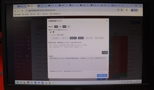 今回、追加された作業結果テキストの生成アシストは、生成AIを活用して点検、修理作業後の報告業務の一部を自動化するもので、データの入力作業にかかる時間を短縮する機能だ。