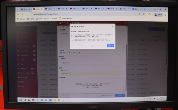 MENTENAでは2025年4月にも、AIを活用したリクエスト内容の整合性チェック機能を追加している。これは、製造現場から保全部門へ作業を依頼する際に、依頼業務における画像の添付漏れや件名のミスなどの記述不備をAIで是正することで、部門間での作業プロセスの標準化や手戻りの削減を目指すものだ。