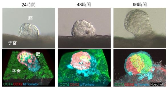 体外子宮システムは、約95%という高い再現性で着床を誘導した。また、胚盤胞の構成成分である壁側栄養膜細胞の接着や栄養芽細胞の浸潤、栄養芽巨細胞への分化などの生体内での着床過程が忠実に再現された。胎児成分のエピブラストや将来胎盤となる胚体外外肺葉の形成など、発生の兆候も示した。
