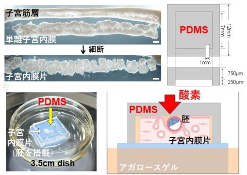 研究グループは、PDMSという酸素透過性を持つ素材を用いて、効果的に酸素供給しつつ胚を子宮内膜に固定する体外子宮システムを開発した。胚盤胞を単離した子宮内膜片と共培養し、着床が起きる側から酸素供給することで、胚は体外子宮に着床し、その後発生が拡大する。