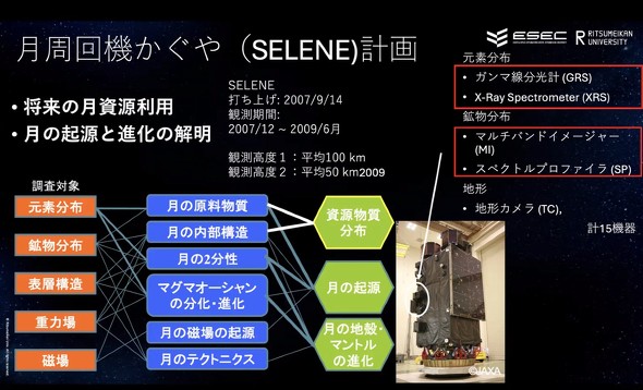 一方、日本が実施した「かぐや計画」は、2007年9月14日に月周回機のかぐやを打ち上げ、元素や鉱物の分布、表層構造、重力場、磁場を対象に、同年12月〜2009年6月に月面を観測した。かぐやでは、元素分布の取得でガンマ線分光計(GRS)や蛍光X線分光計(XRS)を活用し、鉱物分布の獲得でマルチバンドイメージャーやスペクトルプロファイラー(SP)を用いて、地形の撮影で地形カメラを使った。