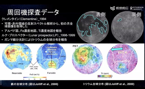 長岡氏は「かぐやのガンマ線分光計で得られたデータを分析することで、月面における酸化カルシウムや酸化鉄、カリウム、トリウム、ウランの分布を可視化した」と述べた。