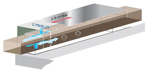 EXC100L+は、完全非接触XY直交テーブルを搭載し、自社製セラミック製エアスライダーとリニアモーターを組み合わせることで、ねじレス駆動が可能だ。これにより、ガイドとスライダーの間のわずかな隙間にエアを送り込み、非接触でスライドするため、摩擦や摩耗、発熱を抑制する。
