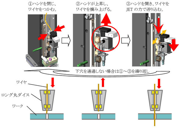 径0.02mmの極細ワイヤに対応した自動結線機能を標準装備し、凹凸のあるワークにも対応する。オプション機能として、光コネクター金型向けの「ロング丸ダイス装着アタッチメント」や、小径狭ピッチの下穴でも安定した結線ができる「Quick Up Search」機能などを用意している。