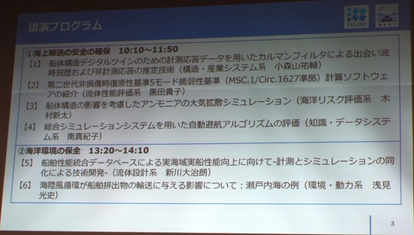 本稿ではこれまで「船でCASE」で積極的に取りあげてきた「海上輸送の安全の確保」のカテゴリーから「総合シミュレーションシステムを用いた自動避航アルゴリズムの評価」など3つの研究発表を取り上げる[クリックで拡大] 出所:海技研「海上輸送の安全の確保」のセッションでは、海技研 研究監の辻本勝氏がイントロダクションを行い、海技研にとって同分野が最重要課題の一つであることを強調した。