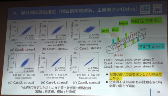 発表では、まず波浪と船体応答の時刻歴を推定するための手法として「ウェーブカルマンフィルタ法(WKF法)」が紹介された。これは、船体に取り付けた加速度計などから得られる船体応答の計測データを基に、波の周波数と方向を含む海象条件をリアルタイムで推定し、計測できない船体部位の応答も再現する手法だ。「設置などにかかる費用などの制約があるので、システムで測れる計測点には限りがあります。少ない計測点の情報から船体全体の状態を把握することが必要だと考えています」(小森山氏)。