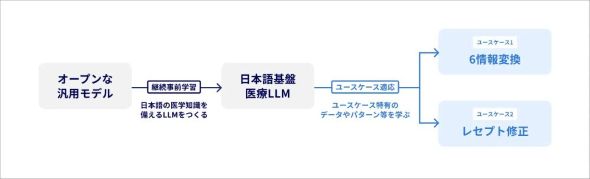 研究では、まず各ユースケースの基盤となる日本語版汎用医療LLMを開発。これをベースに、各ユースケースを解くための日本語版汎用医療LLMの適合に向けたモデルを開発した。なお、共通部分はあらかじめ学習させており、継続事前学習により高性能なモデルを今後も効率的に作成し続けることができる。
