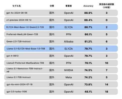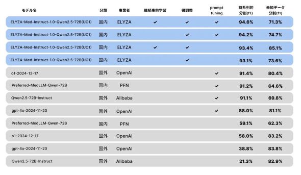 ELYZAは、日本語版の医療LLM基盤「ELYZA-LLM-Med」シリーズを開発した。汎用モデルは国内最高性能、現場の医療タスクではグローバルトップ水準を超える精度を達成している。
