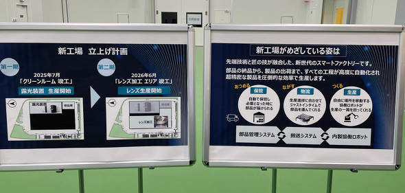 新工場は2023年に着工。今後、装置を搬入して2025年9月の稼働を予定している。まず第1期として新工場内に完成したクリーンルームでi線およびKrF(フッ化クリプトン)の露光装置を製造し、第2期としてレンズ加工エリアを設けて、露光装置に組み込まれるレンズの生産を開始する。設備を含めた総投資額は約500億円、工場の延べ床面積は6万7518m2となっている。2025年中に約550人、本格稼働する2027年以降に約1300人が働く見通しだ。これらは新規雇用や配置転換がまかなわれる。