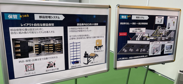 新たな部品管理システムと搬送システムを導入し、全ての工程で高度な自動化を図る。部品の保管エリアでは搬送ロボットを活用し、部品の納品、保管、出庫は全て自動で行う。部品の保管位置は固定されず、自動フォークリフトや搬送ロボットが部品が置かれた棚やパレットごと運ぶことで、レイアウトの自在な組み替えを可能にし、生産進捗に応じて必要時に部品取り出し場所までジャストインタイムで搬送する。