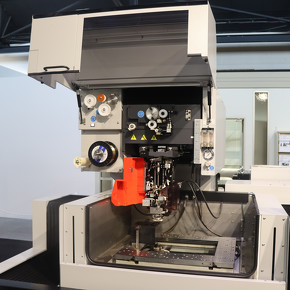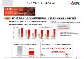 止まらないでは、新しいワイヤ搬送ユニットにより自動結線性能を向上させ、連続加工時間を伸長させた。加工開始時には、ワイヤをワークに通す結線作業が不可欠だ。ワイヤはボビンに巻かれた状態で放電加工機にセットされており、巻き癖(カール)が付いている。そのワイヤを焼鈍し、真直性を向上させるアニール処理の新しい制御システムやリトライ機構によって、自動結線成功率を大きく改善した。