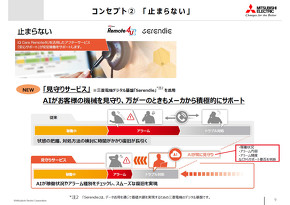 1つ目の見守りサービスでは、三菱電機のデジタル基盤「Serendie」を活用して、AIがユーザーの機械を常に見守り、万が一の時にも三菱電機が積極的にサポートする。FAシステム事業でSerendieを使ったサービスの投入は初めてという。