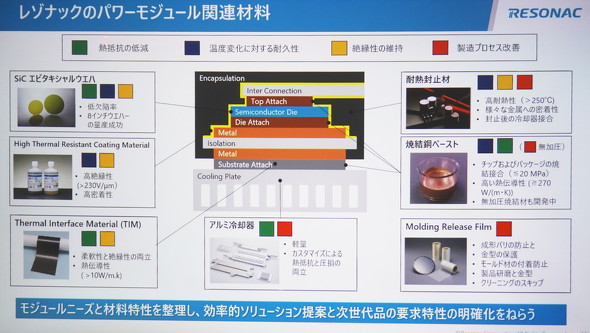 レゾナックはパワーモジュール関連材料として、シリコンカーバイド(SiC)エピタキシャルウエハーや耐熱性絶縁コーティング材、サーマルインタフェースマテリアル(TIM)材、アルミ冷却器、モールド用離型フィルム、焼結銅ペースト、耐熱封止材を扱っている。PMiCでは顧客のパワーモジュールへのニーズとこれらの材料特性を整理し、効率的なソリューションの提案と次世代品で要求される特性の明確化を狙っている。