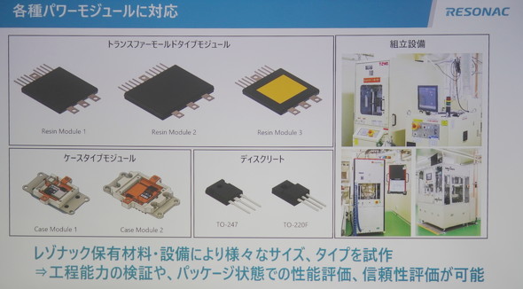 同拠点では、レゾナックが保有している材料や設備により、さまざまなサイズの「トランスファーモールドタイプモジュール」「ケースタイプモジュール」「ディスクリート」などの試作が行える。そのため、研究開発しているパワーモジュール向け材料の工程能力検証や、パッケージ状態での性能評価、信頼性評価が可能だ。