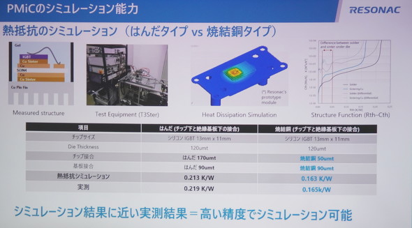 さらに、パワーモジュール向け材料の放熱性や熱伝導率、静電気特性、動的電気特性、絶縁などの性能評価が行える。同材料のパワーサイクルや温度サイクル、高温逆バイアス試験、高温高湿保存試験、高温ゲートバイアス試験などにも対応し、信頼性評価が可能だ。「これらの評価機能とレゾナックが蓄積したノウハウにより、顧客と同等の評価が行える」(畠山氏)。シミュレーション能力も高いという。例えば、はんだタイプと焼結銅タイプのパワーモジュールの熱抵抗をシミュレーションした結果、実測に近い値を導出した。