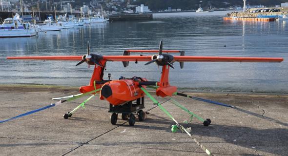 同実験では、ハマが開発した飛行艇型UAVの新モデル「HAMADORI6000」を使用した。同機はガソリンエンジンを搭載し、時速90km以上の飛行速度で最大330kmを航続できる。翼幅が6.3mと大型だが、民生用ドローン向けの非測量用機器を活用し、機材コストの削減を図った。