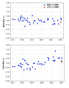 続く相模湾での実海域試験でも海底の位置をcm精度で特定でき、従来の、船舶による計測とほぼ同等の精度を達成した。この実験結果は、船舶を使わずにコストを抑えて迅速に海底の位置測定が可能なことを示すもので、地震発生直後の海底変動把握や、継続的な海底モニタリングへの応用が期待できる。