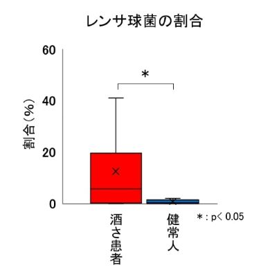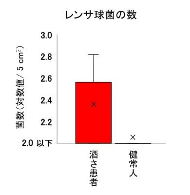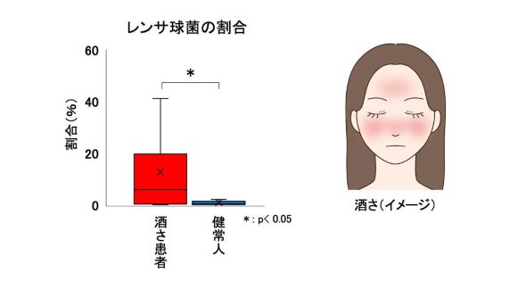 対象者の頬から綿棒で皮膚常在菌を採取し、次世代シーケンサーによって菌叢を解析した。その結果、酒さ患者ではレンサ球菌の占める割合が健常な人よりも高いことが判明した。レンサ球菌は一般的な菌だが、健常な皮膚には少ない常在菌であることから、酒さ患者では皮膚常在菌叢のバランスが崩れている可能性が示唆された。