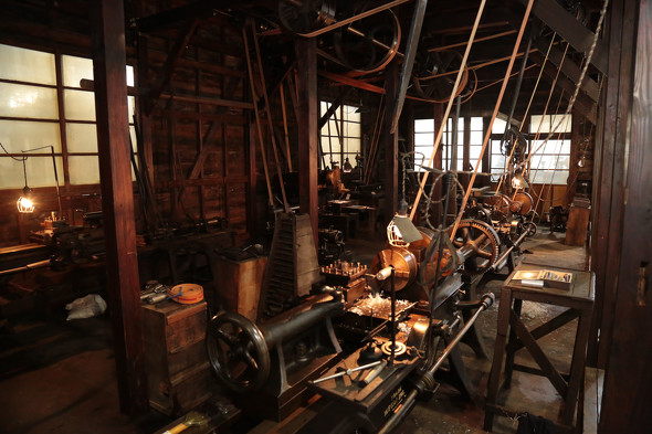 「当時の典型的な町工場で、見学しやすいように手前の壁は取り外し、少しだけ天井を高くしているが、機械は当時の配置のままだ。地面は土間で、照明も当時と同じ白色電球だ」(清水氏)