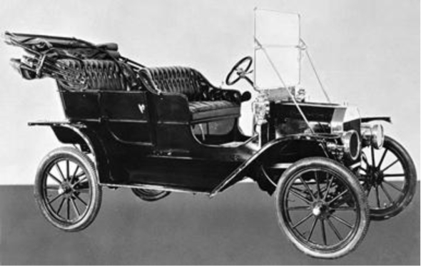※14)ヘンリー・フォードは1896年に初めてガソリン自動車を製造販売する。価格を下げるためには、高い生産の効率化を進めるため、他のモデルを廃止して生産能力をT型に集中させ、大量生産に向けた準備を進めた。当時の自動車の価格が2000ドル以上であったので、850ドルという低価格のT型は、フォードが意図とした大衆車を実現した。大衆の平均年収は600ドルほどで、なんとか手の届く値段だった。安いからといって、作りが悪いわけではなく、ボディーには高張力のバナジウム鋼を使用し、車体強度の確保と軽量化を実現。トランスミッションは遊星歯車を使った半自動方式で、初心者でも簡単に操作できた。エンジンは優秀な鋳物技術を生かして4気筒一体型で、頑丈であるとともに生産性が高かった。点火方式は、最新のマグネトー式を採用。その結果、翌年1年間で1万台以上の爆発的な売り上げを達成した。当時、米国全体の自動車生産台数が7万台程度であったので、1車種の売り上げとしては驚異的なものであった。1910年にはハイランドパークに工場を新設し、量産体制を整えていった。T型は1908年の誕生から1927年の生産終了までに、1500万7033台が生産された。