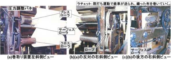 捲取装置は、図14(c)に示すように、筬(おさ)打ち※17)運動を利用してラチェットを駆動し、歯車列によりサーフェスローラを回転させる方式である。図14(a)と(b)に示すように、織物は圧力を調整できるプレスローラにより確実に把持される。布を巻き取るクロスローラはロープによって回転が伝えられ、布巻径が大きくなっても一定の速度で巻き取るようにロープがスリップして回転を調整するようになっている。