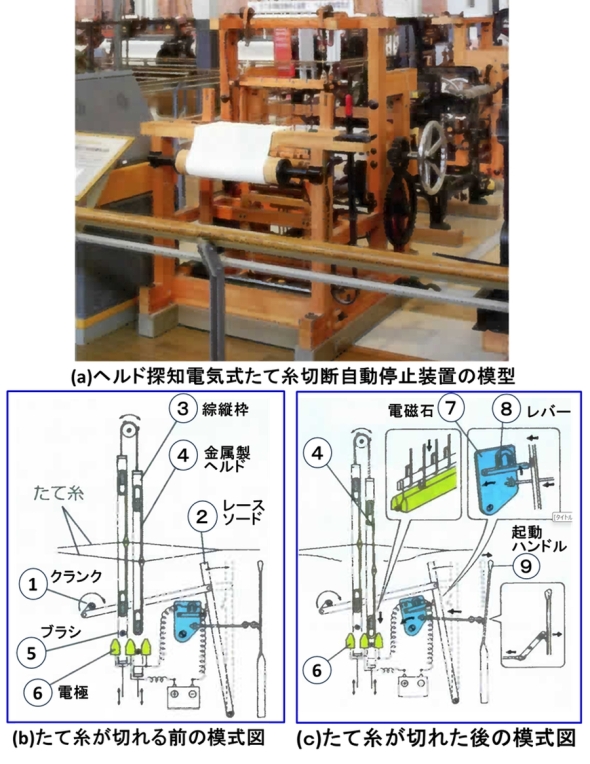 経糸が切れた後は図15(c)のような動作になる。金属製ヘルド(4)が電極(6)の間に落下して通電し、電磁石(7)がレバー(8)を引き上げる。レースソード(2)がレバー(8)を押して、起動ハンドル(9)を解除し織機を止める。