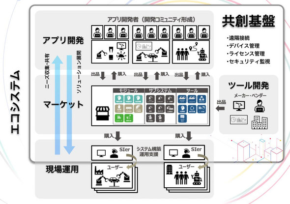 エコシステムでは、ステークホルダー間の情報連携や分業体制のルール作りを進め、ロボットアプリケーション開発者が参入しやすいよう環境を整備する。