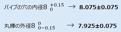 パイプの内径と丸棒の外径は片側公差で与えられているため、まずは「中央値化」を行います。中央値化とは、片側公差を両側公差に変換して表現する方法です。