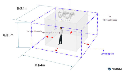 n'Spaceは、ルームスケール環境で1:1の実物大スケール空間を再現する。空間幾何学補正アルゴリズム(Spatial Geometry Compensation Algorithm)で歪みのない映像体験を提供し、疲労感なく長時間利用できる。