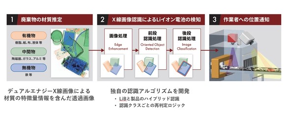 今回の試作機におけるリチウムイオン電池の検知手順は以下の通りだ。まず対象のごみをコンベヤーベルトに乗せて、X線照射装置の対象範囲であるトンネルを通過させる。次にX線照射装置で得られたX線画像を基に、Raptor VISION BATTERYが色や形状、模様などからリチウムイオン電池を画像認識して検出する。