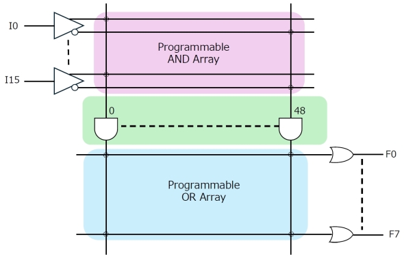 AND Arrayのフルデコードを諦め、その代わりにプログラマブルとしたわけだ。この結果として、AND ArrayとOR Arrayの両方にプログラマブルな回路を利用する必要があり、これがPLAの速度が遅い理由であった。