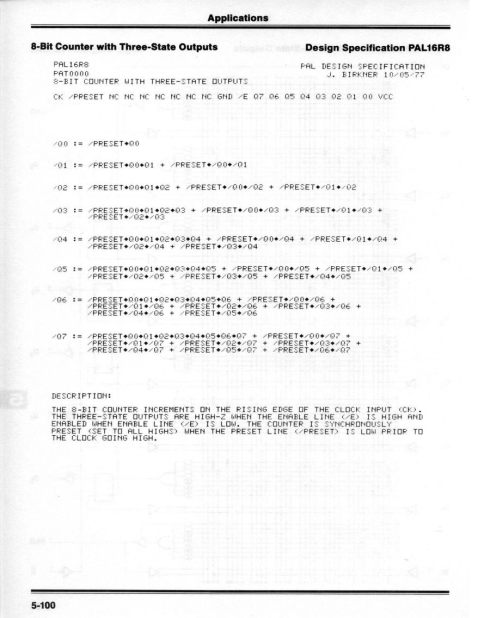 図5 PAL Handbookに掲載された3出力8ビットカウンタのPALASMサンプルコード。Birkner氏自身によるものである。“*”がANDを、“+”がORを意味する。“/”はインバーターだ[クリックで拡大] 出所:MMIPALASMは、IBM 370/166上で動作するFORTRAN IVで記述されていたが、MMIはこのPALASMのソースコードをPALのユーザーに無償で公開する。その結果、顧客はさまざまなFORTRANが動くプラットフォームにこのPALASMを移植して利用することになる(後にMMI自身がMS-DOSに移植を行い、これを無償で提供するようになった)。